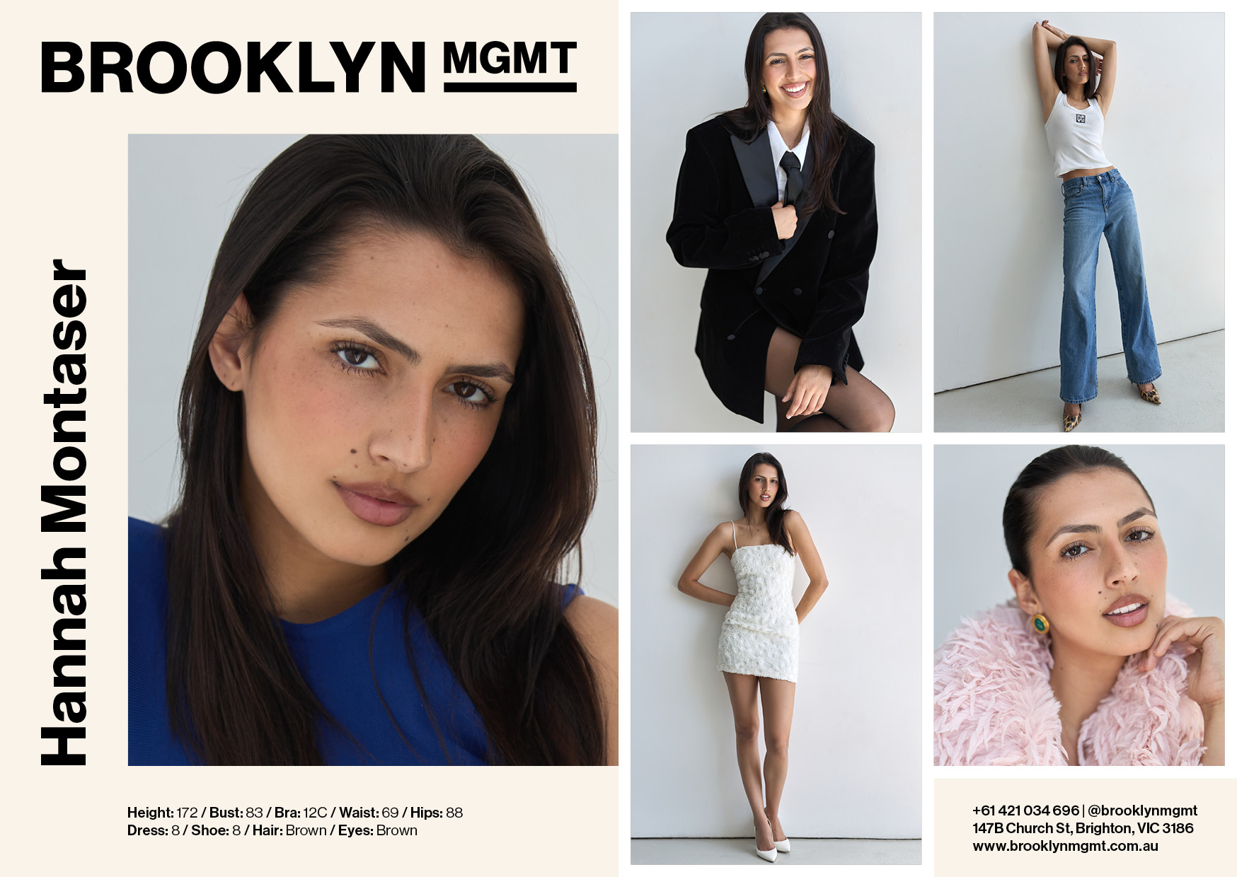 Hannah Montaser 2.02k Download Comp Card Pronouns: She/Her FolioDigitalsComp Card Height: 172 Bust: 83 Bra: 12C Waist: 69 Hips: 88 Hair: Brown Eyes: Brown Dress: 8 Shoe: 8