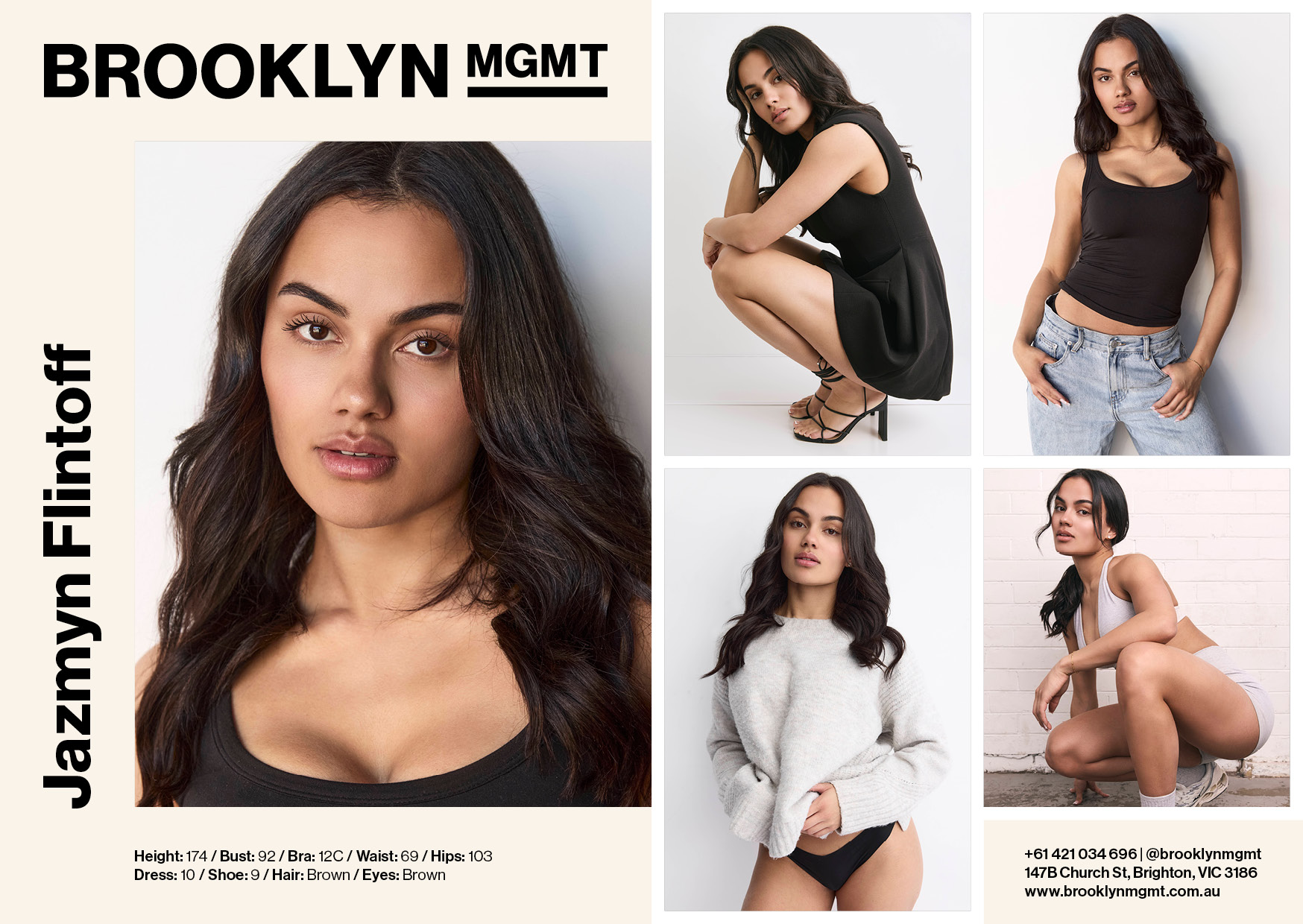 Jazmyn Flintoff 3.66k Download Comp Card Pronouns: She/Her FolioDigitalsComp Card Height: 174 Bust: 92 Bra: 12C Waist: 69 Hips: 103 Hair: Brown Eyes: Brown Dress: 10 Shoe: 9 State: VIC